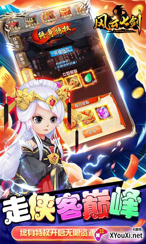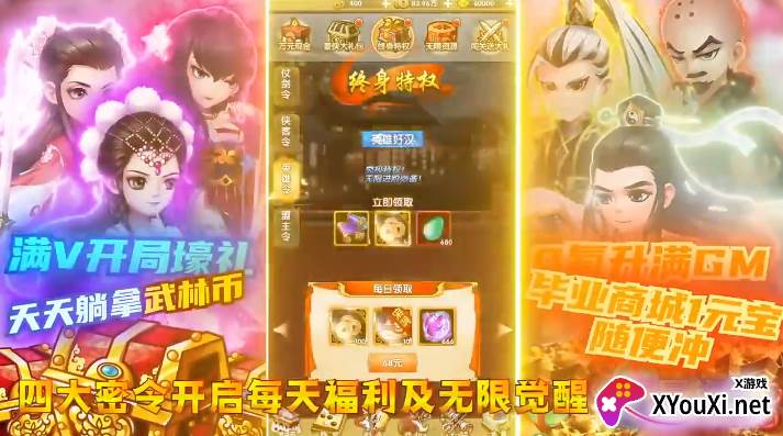 :在线即可领取500元现金卡、50连抽隐士贴、全套顶级红色装备、游侠月卡、无限铜币。更有终身特权:一次购买,终身无忧!仗剑令:BUG级特权,每日免费进阶礼包!侠客令:终极特权,无限觉醒突破!英雄令:究极特权,无限进阶!盟主令:至尊特权,无限紫金碎片与资源!