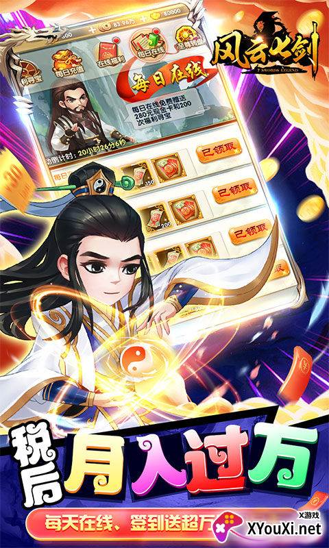 :开服登录即送强力自选三星紫金侠客、2千万元宝、6000秘宝,紫金豪礼抽到爽!每月签到更可免费领取9000元现金卡、120W元宝、红侠碎片及海量珍贵材料!