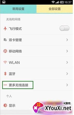 步骤三:在“设置”菜单中,选择“更多无线连接”选项。