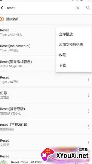 3. 以“reset”为例,搜索结果瞬间呈现,点击即可播放,下载或加入播放列表,随你心意。