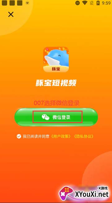 1. 在X游戏网下载豚宝短视频APP,选择微信一键登录。