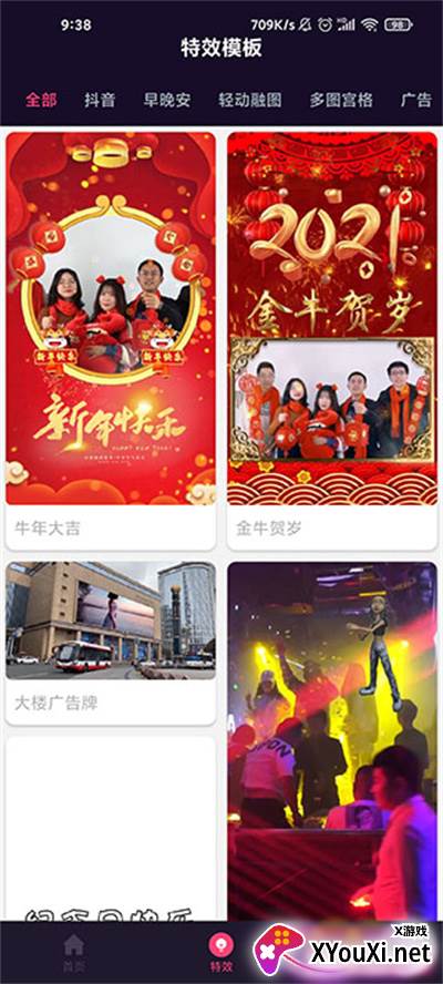 2.在“特效”区域,琳琅满目的模板等待您的发掘,从通用百搭到早晚安问候,再到创意广告,总有一款是您的菜。