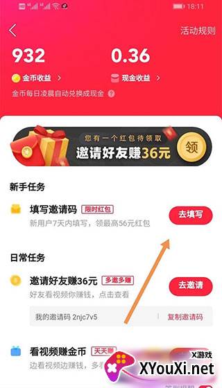 3. 点击“去填写”邀请码的按钮。