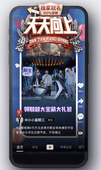 如今,刷宝APP借助《天天向上》的强大平台,已成功走进千家万户的视野,被誉为国民级的短视频应用。