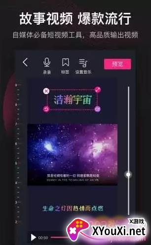 - 故事视频:中间视频,上下添加背景与字幕,讲述你的精彩故事。