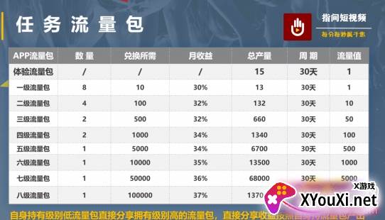 - 八级流量包: 数量1,兑换需100000,月收益37%,总产量137000,周期30天,流量值10000。