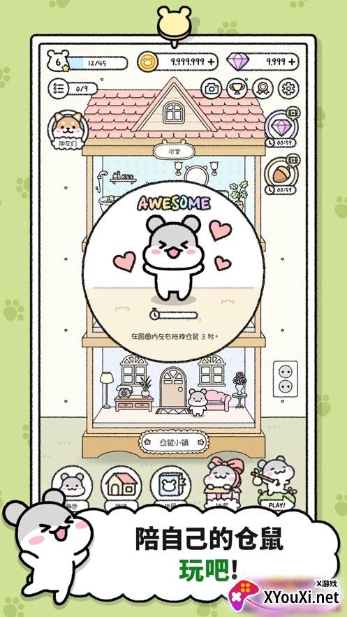 游戏玩法简单却极富挑战,轻松点燃你的竞争激情。一眼便能让你沉醉的可爱仓鼠生活,正等待你的悉心照料。收集闪亮的星星,亲手扩建并精心装扮你的专属仓鼠小屋。与你的仓鼠伙伴们嬉戏玩耍,收获满满的甜蜜惊喜。