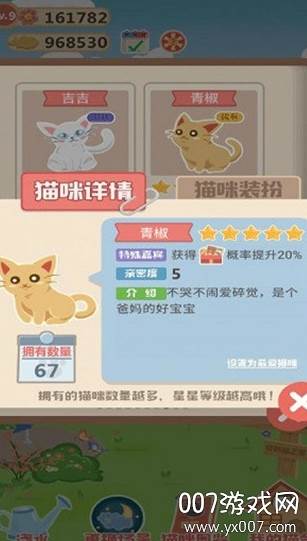 3. 别忘了让你的猫咪外出探险,它们会为你带回更多奇妙的猫咪种子,解锁更多品种的萌猫!当你成功种植并收集到25只猫咪时,还将解锁二楼的猫舍,空间的拓展意味着更多惊喜的到来!
