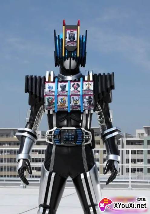 设计理念与帝骑哥如出一辙,超级海东神主形态的胸口和肩甲都密布着各式卡片。整体造型保持不变,额头上点缀着两张卡片,而蓝色的披风更是贴满了平成假面骑士的副骑卡片。值得一提的是,海东所收集的卡片并非仅限于二骑,而是涵盖了全部的副骑,展现了他作为副骑集结者的独特魅力。