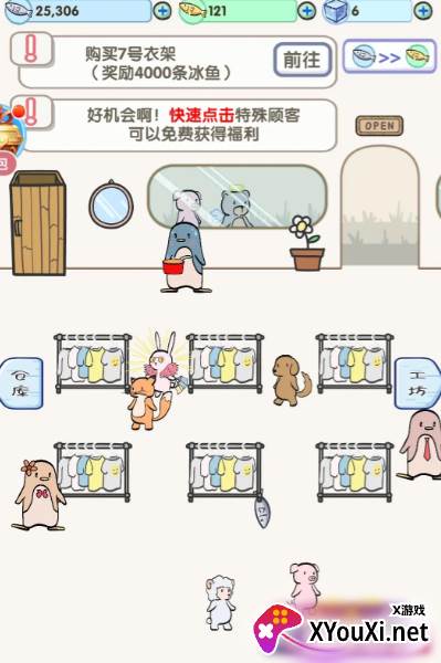 在你的精心打理下,这家动物主题的服装店将迎来一群可爱的同伴,以及络绎不绝的顾客。你将与这些萌趣十足的动物朋友们并肩作战,共同将这家小店发展壮大,谱写属于它们的时尚传奇。
