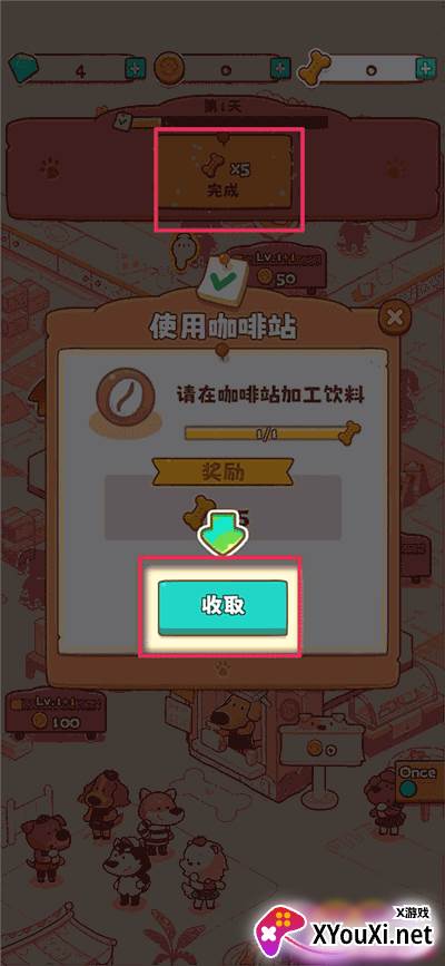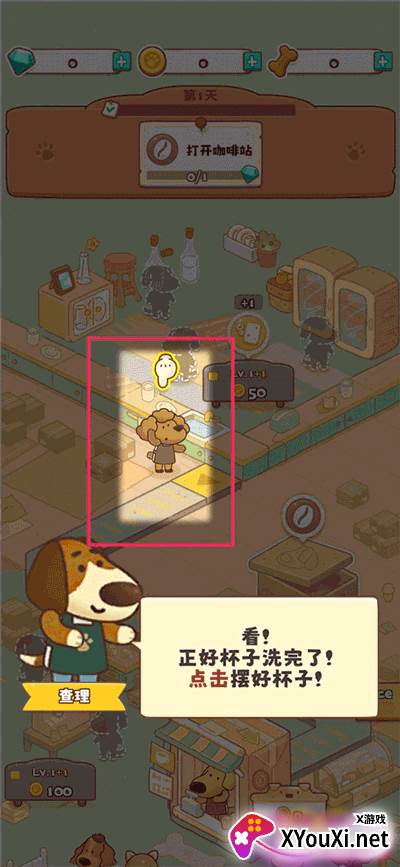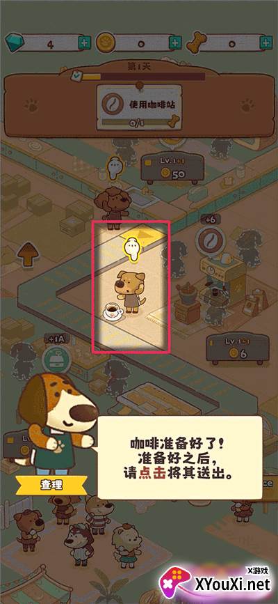3. 清洗完毕的杯子将被送往咖啡馆。待负责制作咖啡的小狗狗完成饮品后,点击即可将其送出。