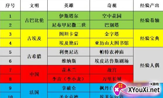 依据不同文明的特色,玩家需逐一合成相应的英雄与宏伟奇观。一旦奇观落成,每日便可收获丰厚产出:主要为经验道具(用于英雄升级),辅以艺术岛物品、青铜粉、红宝石粉、闪耀星辰、实用铲具及嫩绿树苗等。当前版本已开放五大文明,共计十位英雄与十座奇观,详情如下: