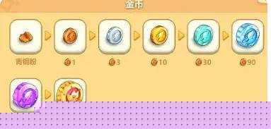 以金币的合成路径为例(为便于区分,我们按等级依次称呼为:青铜粉→铜币(1)→银币(3)→金币(10)→白金币(30)→钻石币(90)→紫晶币(270)→王者币(810)):