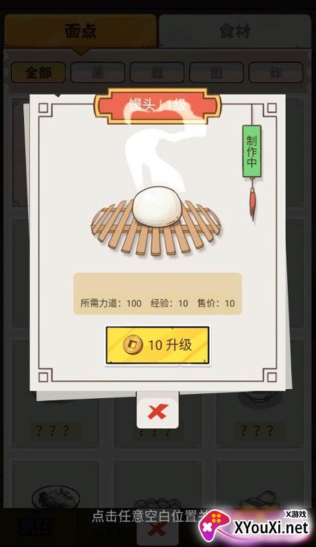 在制作界面,只需轻点空白处,即可源源不断地制作面食,随后蒸熟售卖,开启你的财富积累之路。