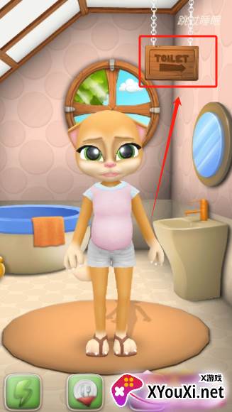 3、底部菜单找到“厕所”,进入场景后,点击右上角的木牌,引导艾玛完成她的“私人时间”。