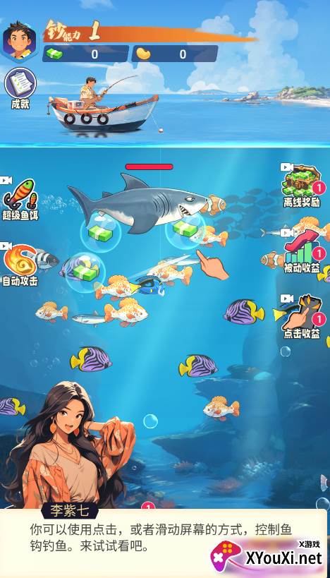 《钓鱼吧少年》——抖音爆款点击经营小游戏!开局解锁一处钓点,你将通过不懈点击,捕获珍稀鱼类,兑换丰厚金钱,进而解锁魅力助理,开启你的“海王”人生。在这片广袤海洋上,你将亲手缔造属于自己的渔业帝国,并邂逅一段感人至深的故事。现在,就启程你的钓鱼之旅,成为传奇的渔业大亨吧!