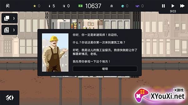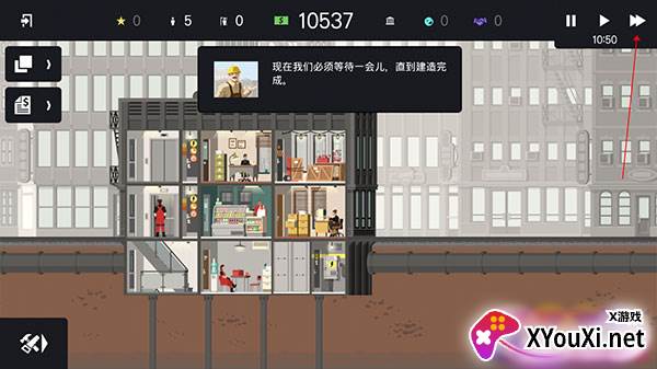 7. 稍候片刻,施工队便会进场施工。若想加快进程,可点击右上角的加速按钮;前两个选项分别为暂停和恢复正常速度。
