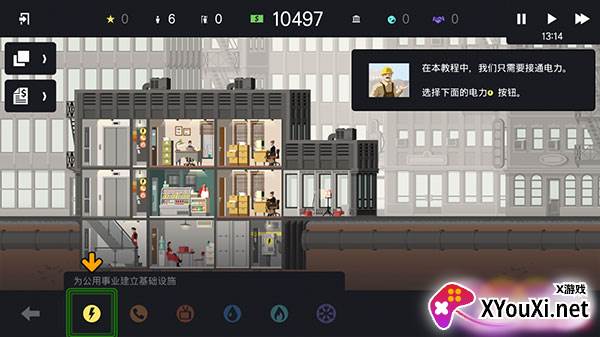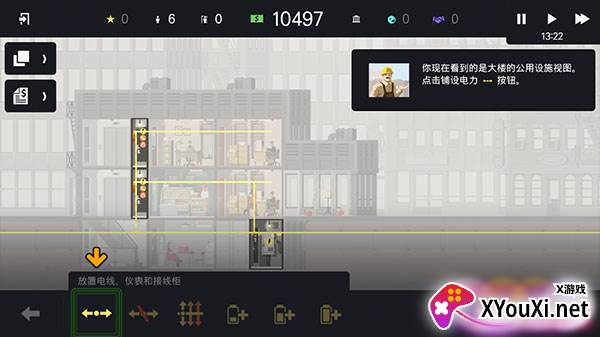 8. 新落成的办公室需要电力供应。点击左下角,找到电力设施选项,开始铺设电网。