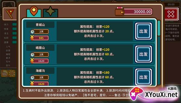 - 出门箭头: 前往医院。当角色生病时,需耗费金钱与时间就医。