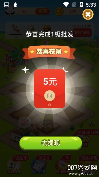 《幸福小镇挂机领红包版》是一款轻松惬意的养成经营类赚钱游戏。只需遵循游戏指引,辛勤耕耘,便能收获颇丰。随着投入的增加,你的小镇将日益壮大,扩张升级,而这一切,只需放置挂机,无需时刻紧盯,便可尽享休闲赚钱的乐趣。