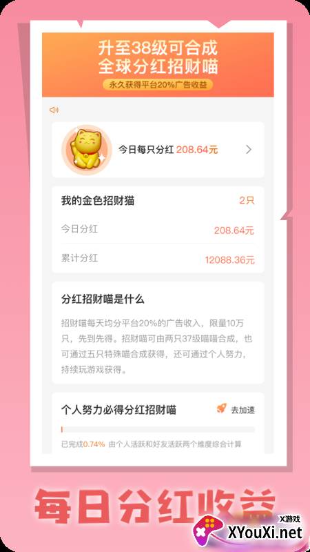 初次加入“慧眼喵”的玩家便可喜获红包一份。不仅如此,每当你的猫咪等级提升,都会有相应的红包奖励奉上。当猫咪升至10级,你将有机会解锁限时分红猫;若能培养至38级,更有机会获得永久分红猫的青睐。