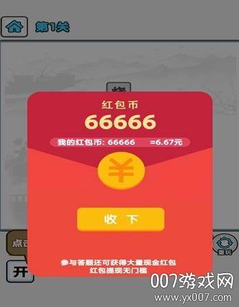 这是一款能让您通过答题领取红包、赚取零花钱的游戏。虽然核心是成语玩法,但其盈利模式主要依赖于观看广告。每当您成功领取红包后,系统会强制要求观看一条广告。平台提供两种可提现的货币:金币和红包,它们的主要来源是通关奖励,每通过一关,都会随机获得红包或金币。