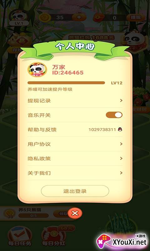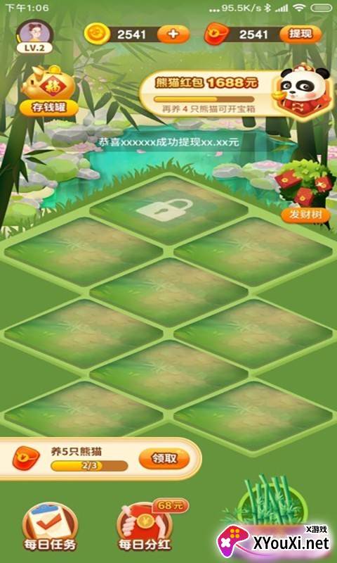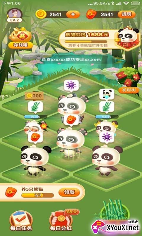 首次提现门槛极低,仅需0.3元即可秒到微信钱包。后续提现则需累积满20元,并收取3%的手续费。每当熊猫等级提升一级,玩家便能获得一次红包奖励,金额大约在0.1元左右。此外,熊猫还可以参与各类任务,每成功闯过一关,都会获得幸运红包,虽多为0.1元,但偶尔也能收获0.2元或0.3元的大奖,惊喜不断。