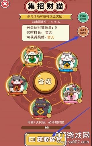 游戏内亦有“招财猫”玩法,集齐五只即可合成黄金招财猫,每日分享红包奖励。