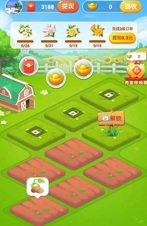 新人登录后,根据游戏提示种植第一批鲜花,完成一级订单即可立即提现0.3元。